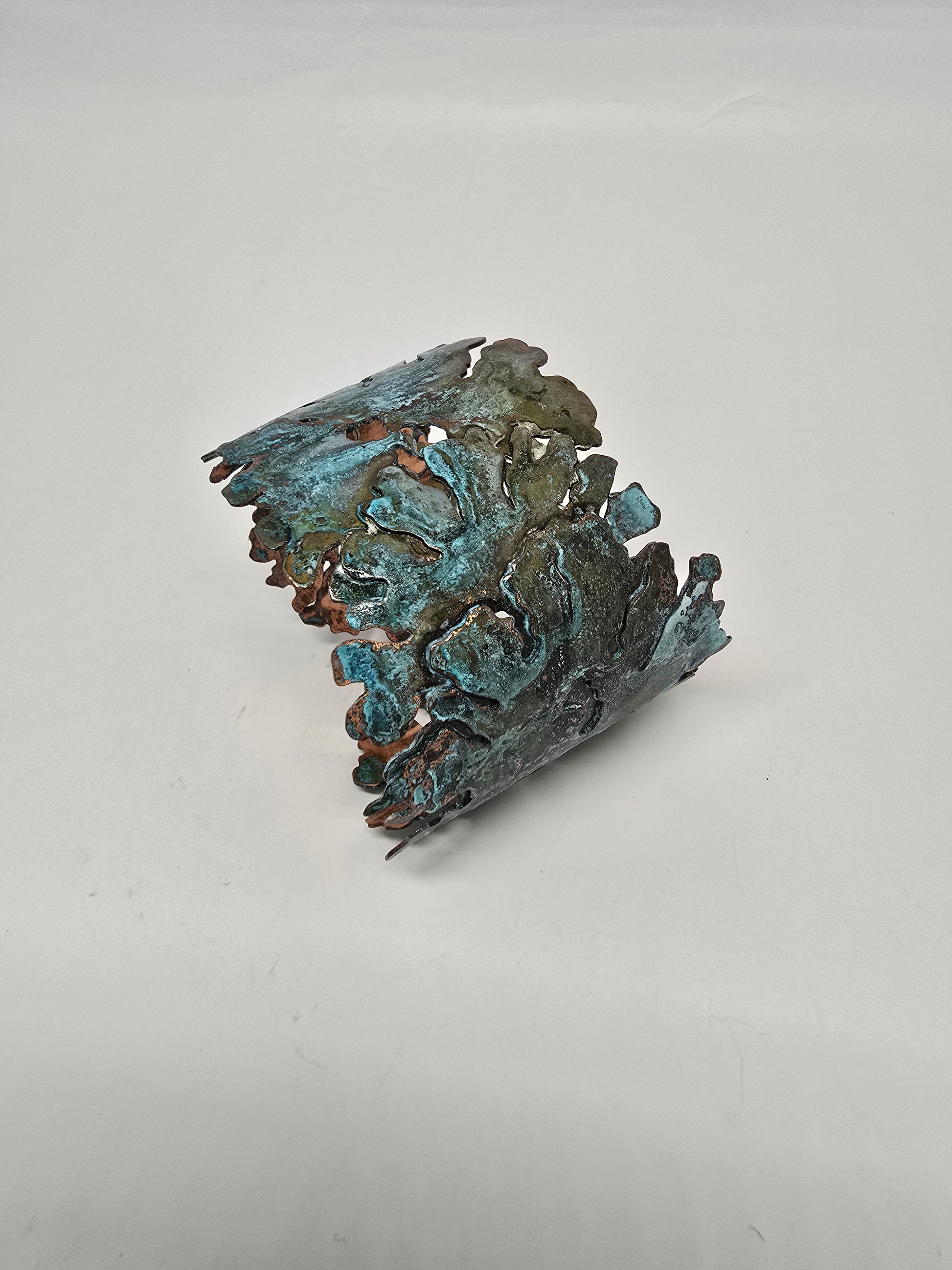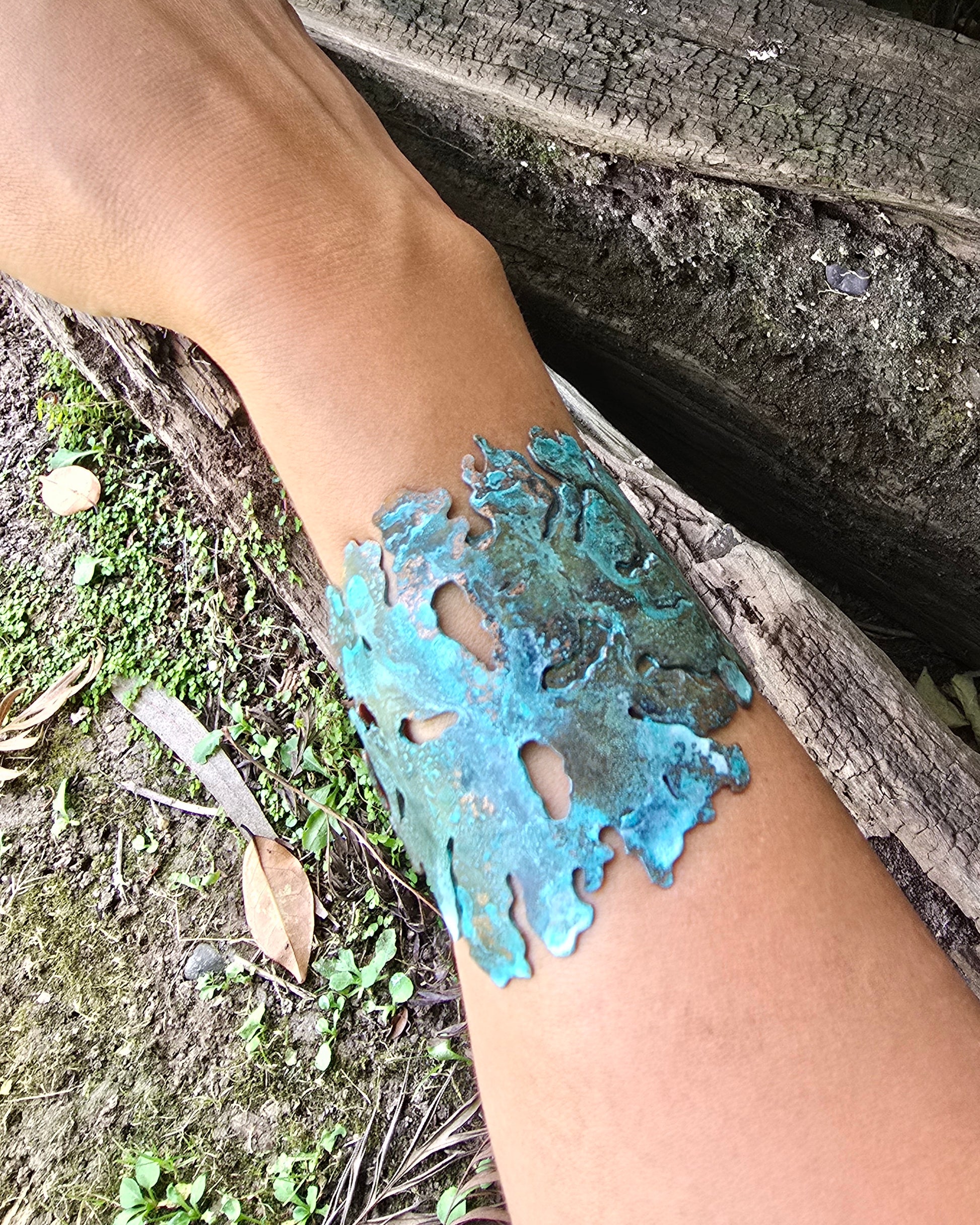 Brazalete artesanal en cobre con pátina celeste inspirada en los líquenes nativos de Chile. Su diseño ajustable se adapta a diferentes muñecas, permitiendo un ajuste personalizado y cómodo. Elaborado con técnicas tradicionales de orfebrería, cada pieza es única. El cobre envejece naturalmente, creando tonalidades azuladas características que evocan la biodiversidad de nuestros ecosistemas. Una joya que combina belleza natural con conexión territorial.